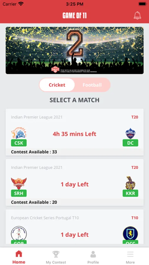 Simply Sign Up, Select a Match, Create your Team by choosing 11 players and join the contests. Prove your skills on Game of 11, biggest fantasy sports out there!. Track your player's performance in real-time and be on top of the Leader Boards to win prizes. Prove your skills and embrace Victory!.