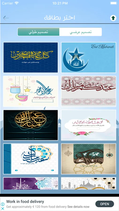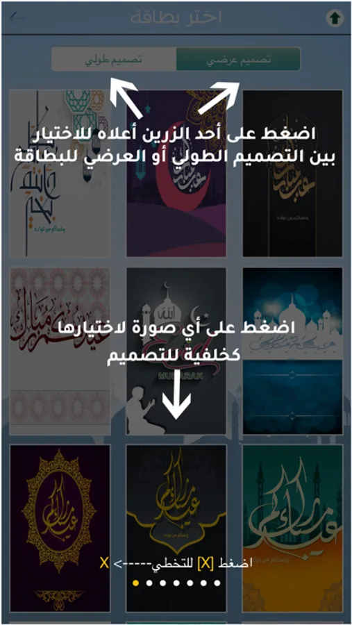 يمنحك تطبيق كروت المعايدة خيارات للاختيار من بين البطاقات الطولية أوالبطاقات الأفقية. يمكنك أيضا اختيار خلفية البطاقة بواسطة ألبوم الكاميرا أو بواسطة التقاط صورة.