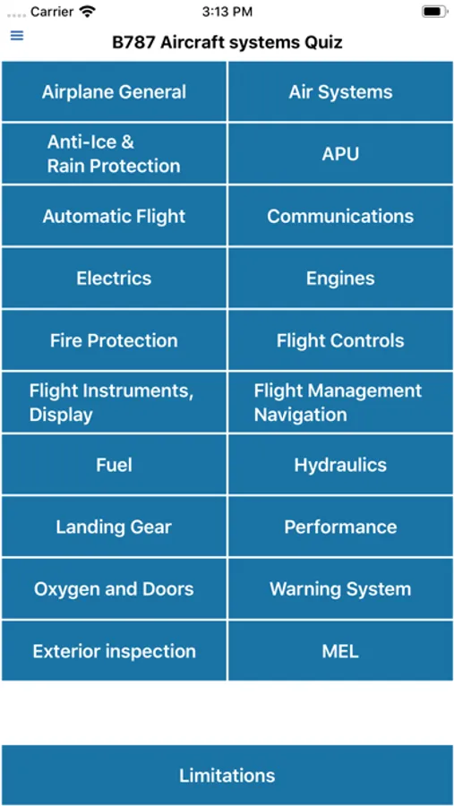 - System Quiz over 370 questions: The following topics are covered: Airplane general, Air systems, Anti-ice and Rain protection, APU, Automatic flight, Communications, Electrics, Engines, Fire protection, Flight controls, Flight instruments, Flight management navigation, Fuel, Hydraulics, Landing gear, warning system. I also added few general questions for Exterior inspection, MEL and Limitations.