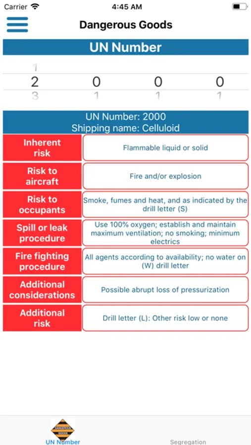 - Dangerous Goods (by UN Number): You can choose any UN number by the number picker and instantaneously get the description and the drill for it.