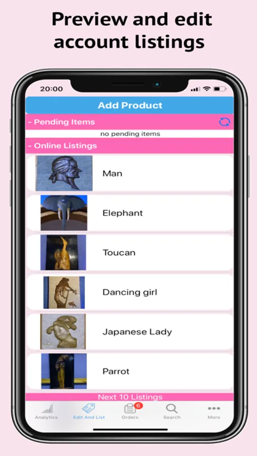 -- List your handmade product on the fly. Go to the “Edit And List” icon on the tab bar, you can load up to three pictures for each listing. There are two sections for your added products: Pending Items and Online Listings. After you added your products, they will be first shown on the Pending Items section. After a careful check by our support team to make sure the products listed belong to handmade category, and also description matches the picture, then we will approve the new listing. After the approval, the new listing will go to Online Listings section, which means your listed products become live on Peppaca platform now.