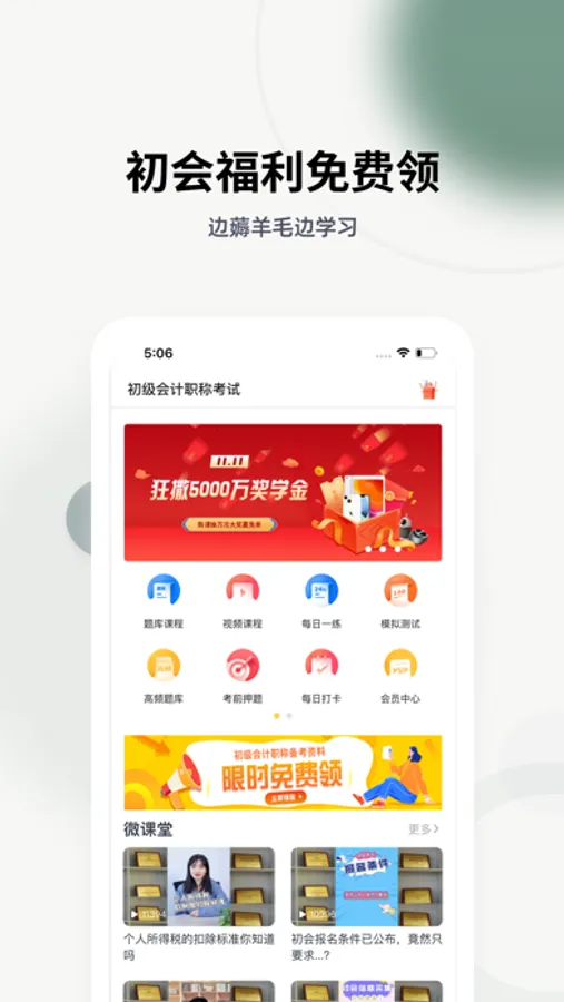 新人礼包助力备考,注册即享初会考试礼包,在线视频课程,智能题库大礼包