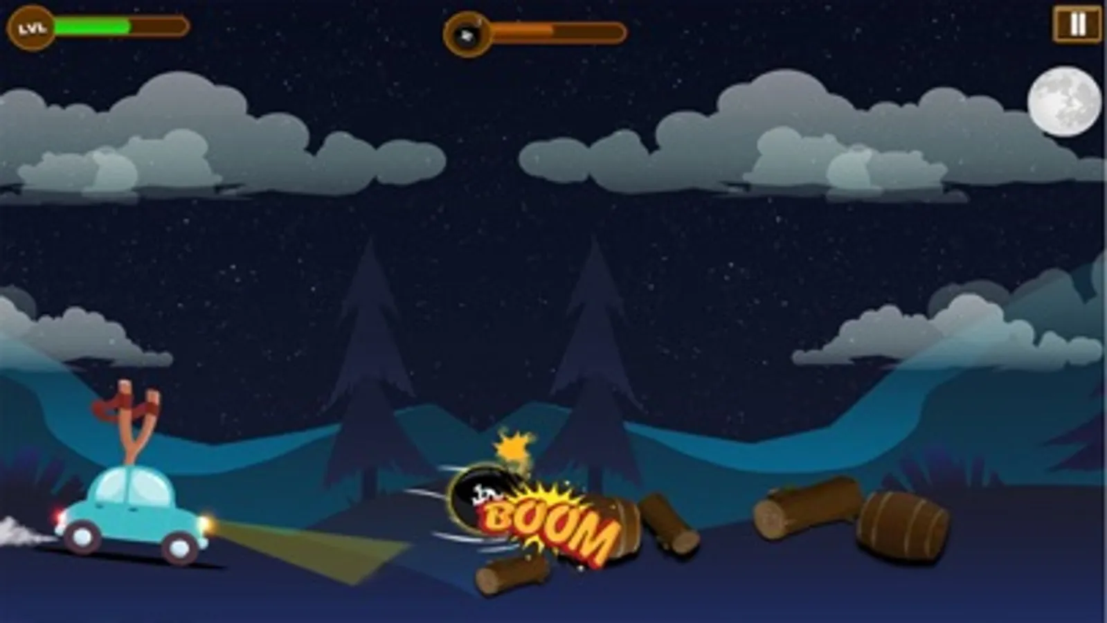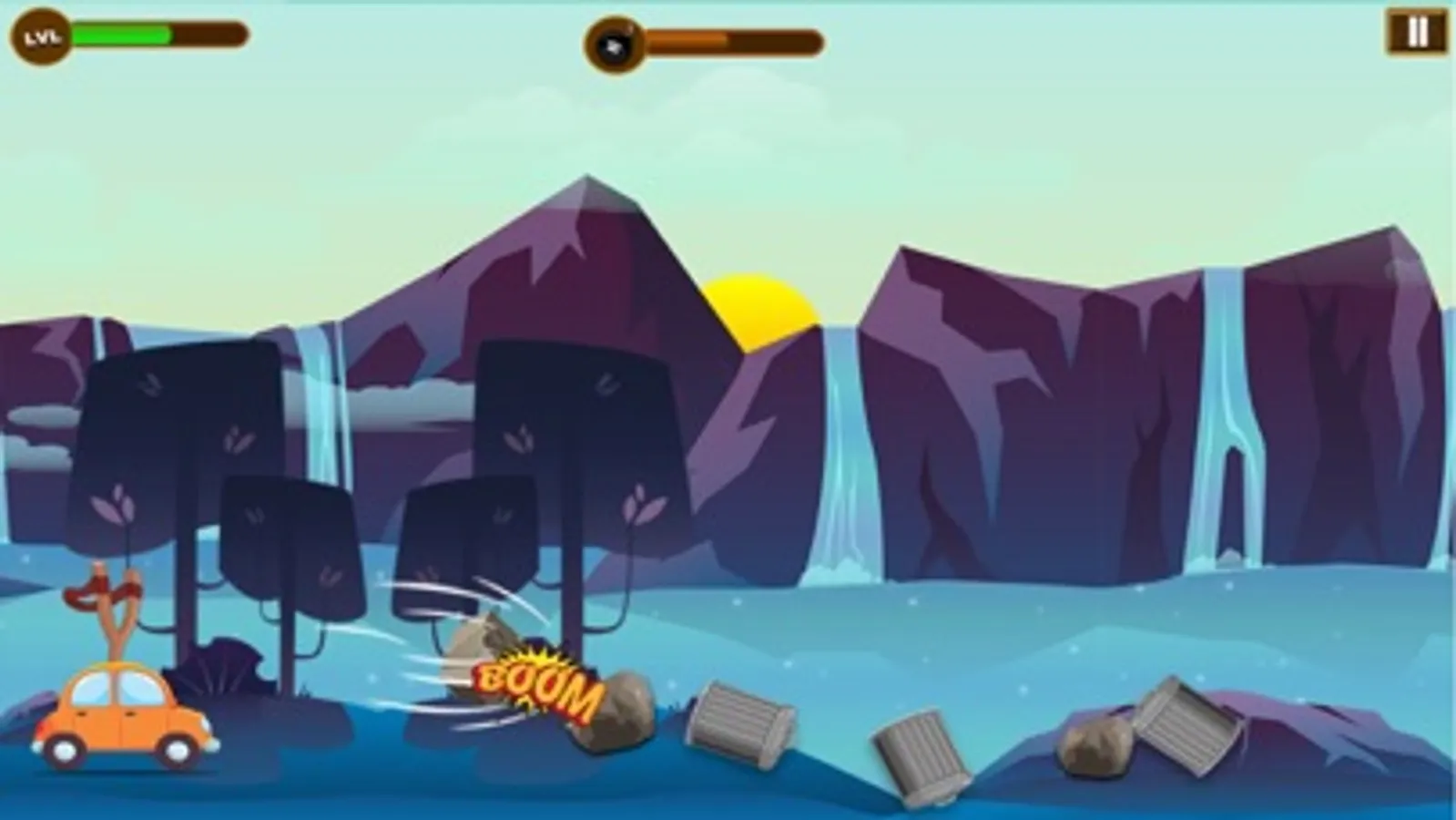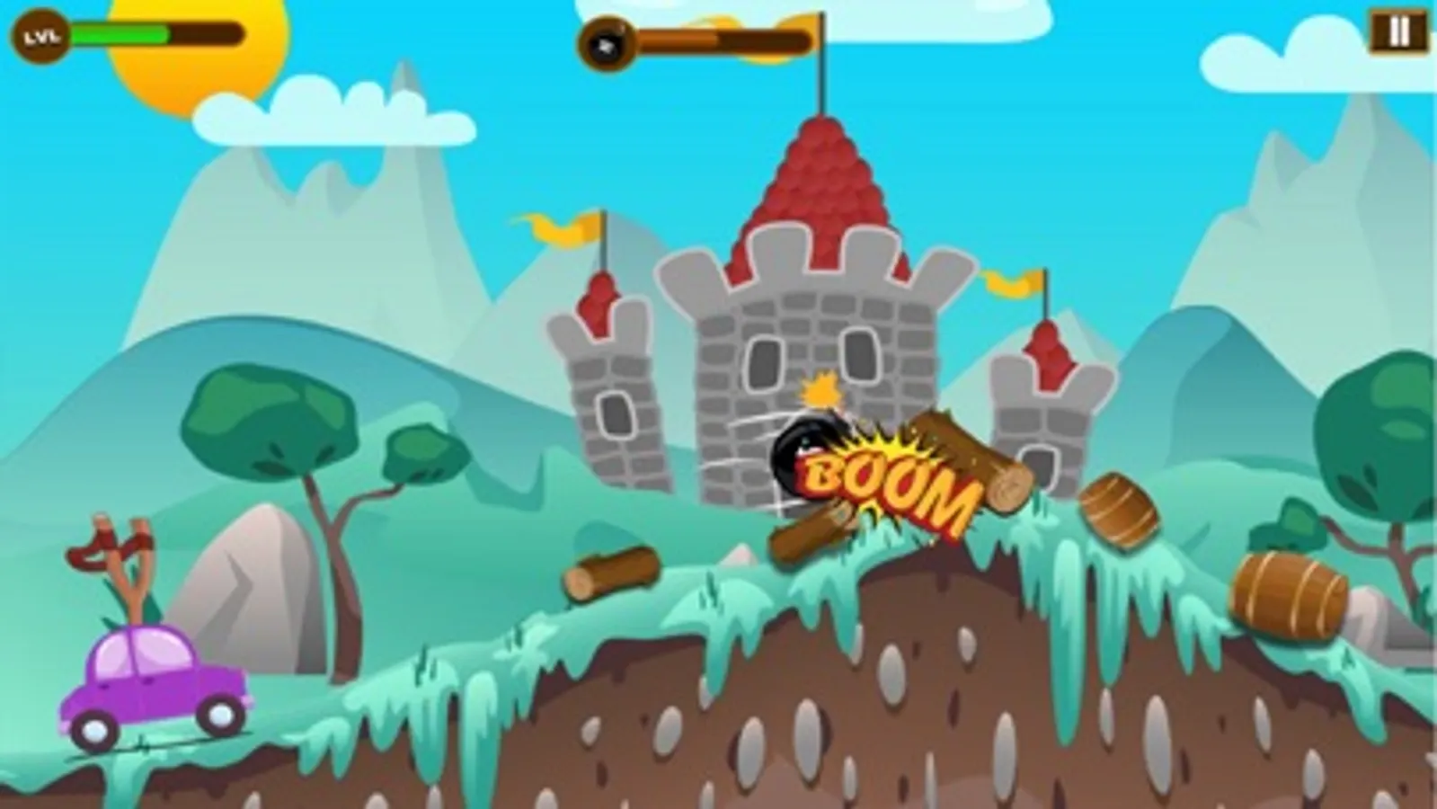Have you ever play Slingshot game? Oooo Yes here is a car with sling on the top of it.Pull the sling and destroy the target. Drive and clean the hill road to climb on the top of the mountain.