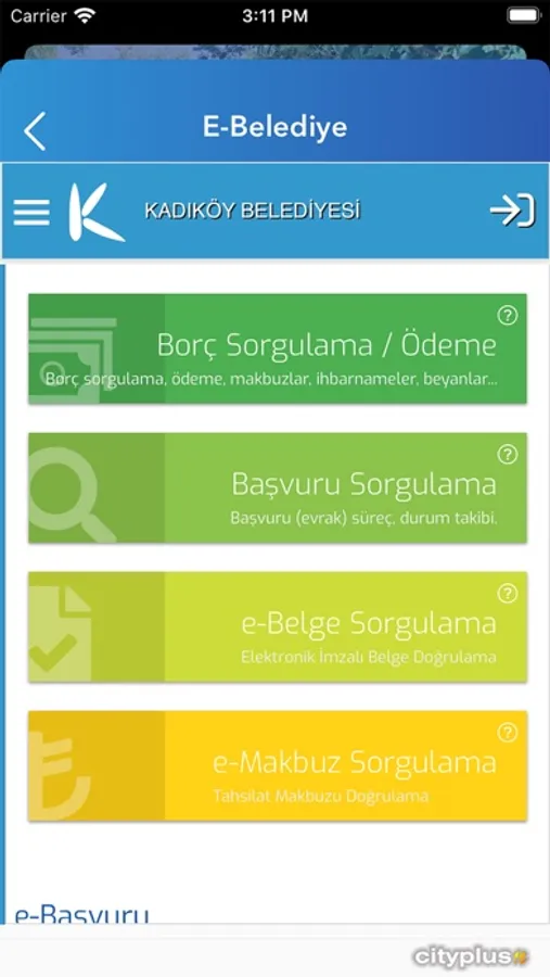 Kadıköy Belediyesi mobile uygulamasıdır.Vatandaşlarımız bu uygulamayla mobil telefonlarından, Kadıköy Belediyesi ile ilgili güncel haberlere, etkinliklere, kent rehberine, güncel ihalelere ve diğer bilgi servislerine ulaşabilmektedir.Yine bu uygulama sayesinde vatandaşlarımız vergi borcu sorgulaması ve ödemesi yapılabilmekte;