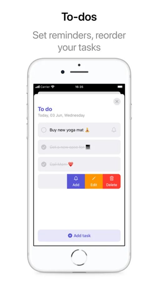 ■ Tasks: add todos, set reminders, hold and drag to reorder your list