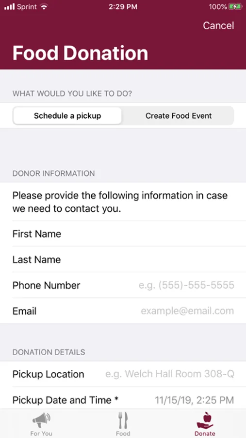 3. Donate section - Request a food pickup or create a free food event and invite students as guests when extra food leftover at your private campus events. Just fill out a simple form to reduce food waste and help address student hunger.