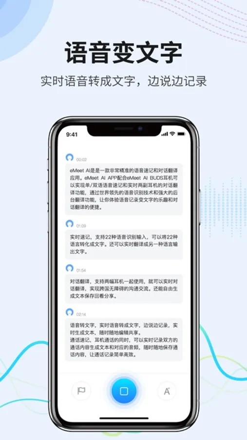 eMeet AI是是一款非常精准的语音速记和对话翻译应用。eMeet AI APP配合eMeet AI BUDS耳机可以实现单/双语语音速记和实时两副耳机的对话翻译功能,通过世界领先的语音识别技术和强大的后台翻译功能,让你体验语音记录变文字的乐趣和对话翻译的便捷。