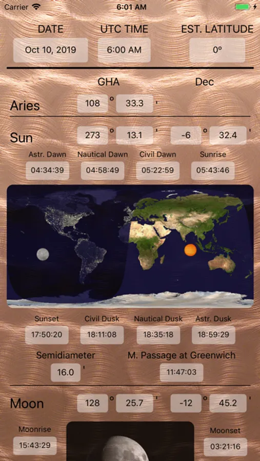 Simply select date and time and all values are recalculated instantly. The estimated elevation value is only needed for calculating sunrise/sunset, twilight, and moonrise/moonset.