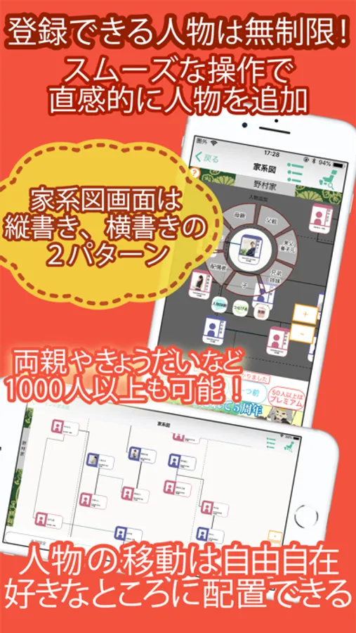 ・無料でも50人までご登録いただけます。親、兄弟、叔父、叔母、いとこ、はとこ、祖父、祖母、曽祖父、曾祖母、高祖父、高祖母やひ孫、玄孫、来孫、昆孫などの子孫まで、たくさんの親族が一つの系図で見られます。続柄がわからなくても、直感的に登録できます。