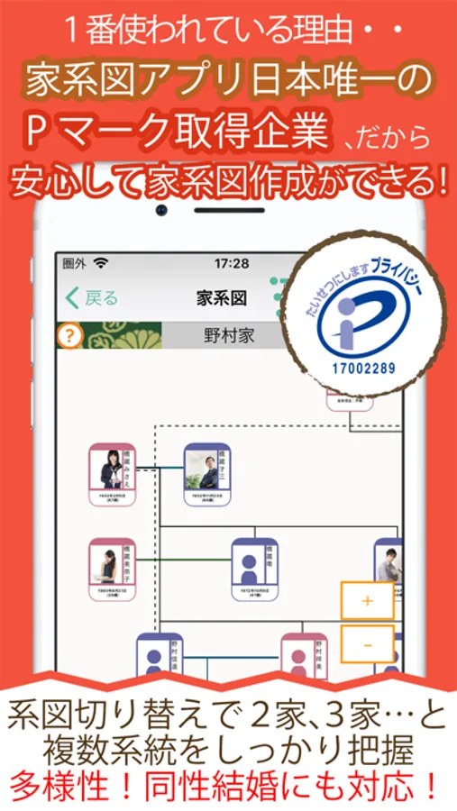 家系図アプリは、家系図取扱業として唯一のプライバシーマーク取得企業が運営しておりますので、安心・安全にご利用いただけます。