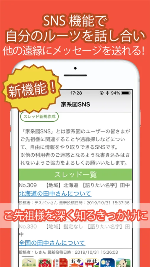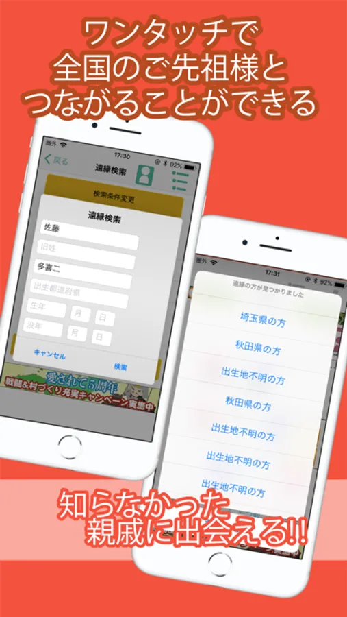 ・「遠縁検索」機能ではユーザー様の公開情報の中から、遠縁やご先祖様を検索し、知ることが可能になります。テレビ番組でも話題の遠い親戚探しが、あなたのスマホでかんたんにできます。