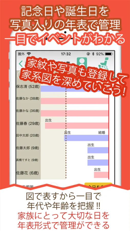 ・「家族年表」機能を使い、ご自分や親戚の記念日や誕生日(生年月日)を写真入り年表としてまとめることで、家族にとって大切な日をわかりやすく管理することもできます