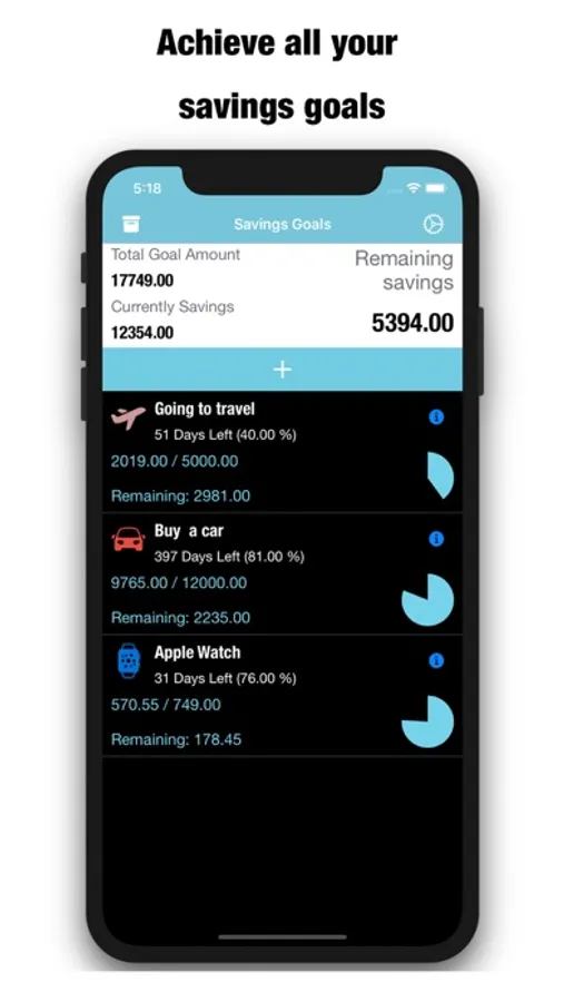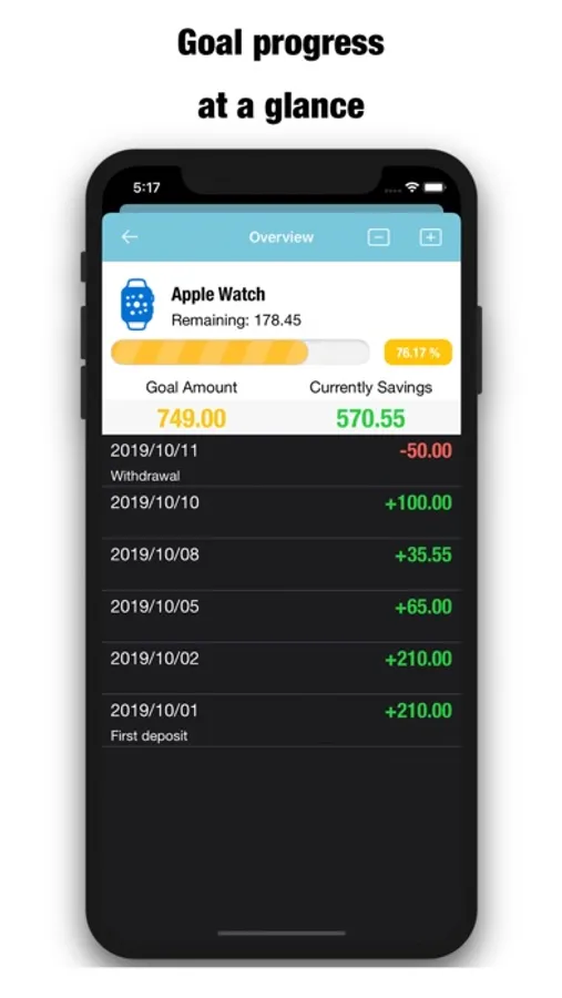 - Set a savings goal and visually see your progress.
