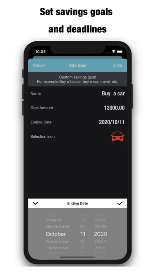 1, First use SavingMoneyBox to create a buy car plan / savings target