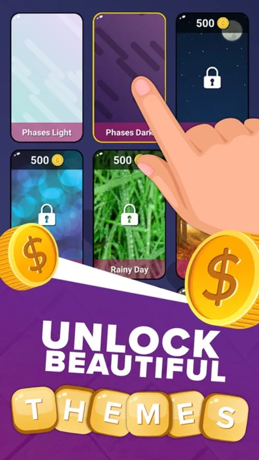 To get you going more in the word puzzle game, we designed original graphics and gameplay for each word game. Enjoy exquisite graphics, simple UI and mind-teasing challenges. Make use of the daily gifts and collect coins to get our custom themes for even more beautiful gaming experience.