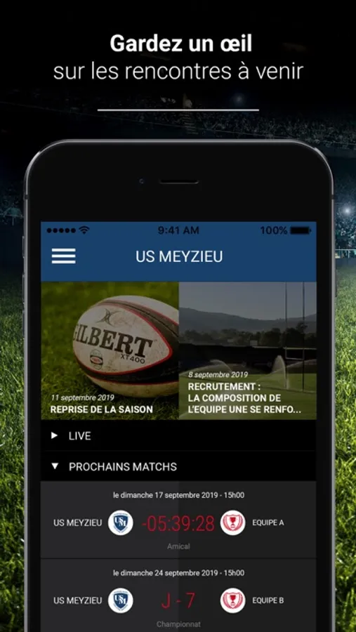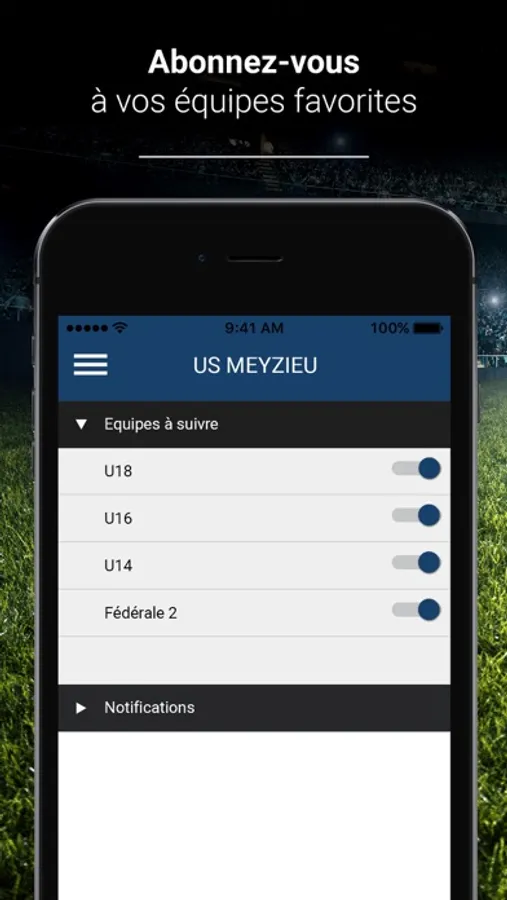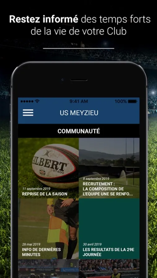 L’application US MEYZIEU vous permet de suivre toute l’actualité de votre Club favori. Vous pourrez vous abonner à vos teams préférées (équipe 1, cadet, U18, féminine,…) et suivre en direct chaque rencontre sportive faisant l’objet d’un Live. A vous de soutenir votre Club : l’application vous permet d’interagir avec l’équipe pour l’encourager ou pour siffler des séquences de jeu. Pas besoin de lancer l’application pour être au cœur de l’action. Les actualités de club ou la séquence de jeu vous sont envoyés par notification. Bons Matchs.