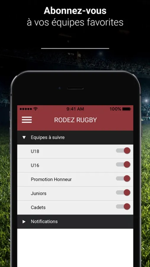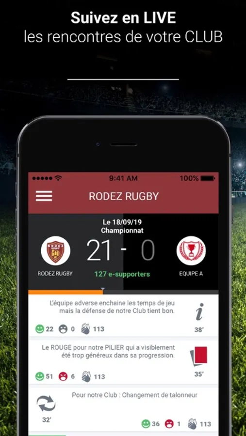 L’application Rodez Rugby vous permet de suivre toute l’actualité de votre Club favori. Vous pourrez vous abonner à vos teams préférées (équipe 1, cadet, U18, féminine,…) et suivre en direct chaque rencontre sportive faisant l’objet d’un Live. A vous de soutenir votre Club : l’application vous permet d’interagir avec l’équipe pour l’encourager ou pour siffler des séquences de jeu.