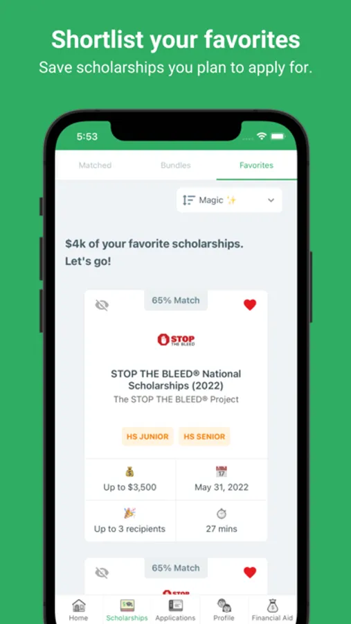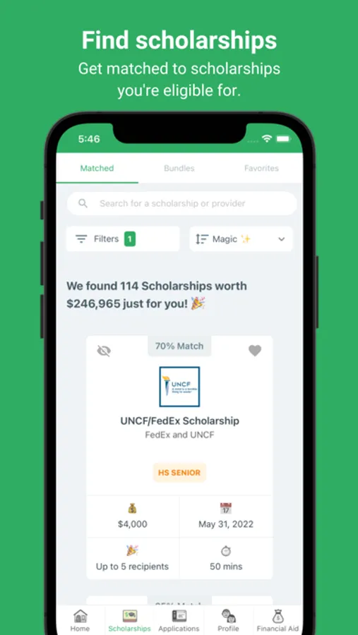 Get applying faster. Less browsing and sifting through scholarships that aren’t applicable to you.