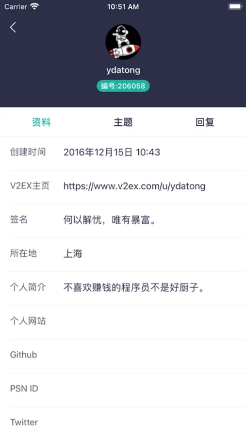 10.查看v2ex上用户的个人主页(用户资料,主题,回复)内容。对用户进行关注(取消关注)。