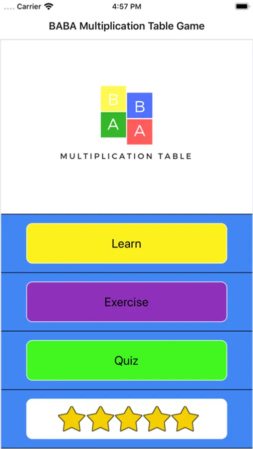 BABA Multiplication Table Game have 3 steps: Learn, Exercise and Quiz.