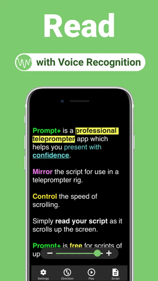 * Scroll the teleprompter using voice recognition (iOS 13+) or speed control.