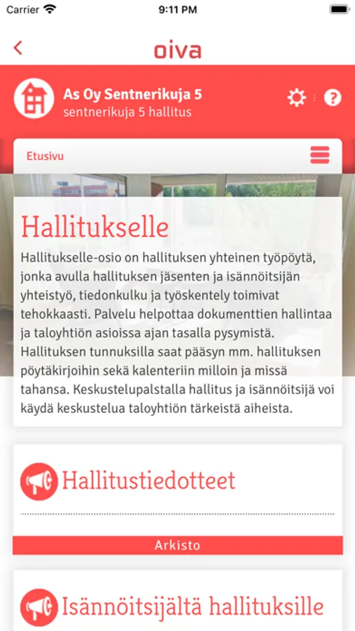Sähköisen asioinnin kanavana luomme sinulle mahdollisuuden saada informaatiota ja hoitaa asumiseen liittyvät asiat sinulle sopivana ajankohtana paikasta riippumattomasti. Pääset tekemään ilmoituksia ja tilauksia isännöitsijätoimistollesi sekä kiinteistöhuoltoon sinulle sopivimpana ajankohtana. Tuomme lisäksi mahdollisuuden saada informaatiota asumisympäristöstäsi sekä pääset yhdellä kirjautumisella kaikkien taloyhtiösi yhteistyökumppaneiden tarjoamiin tietoihin keskitetysti.