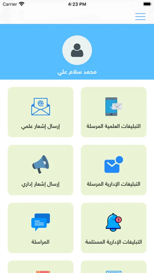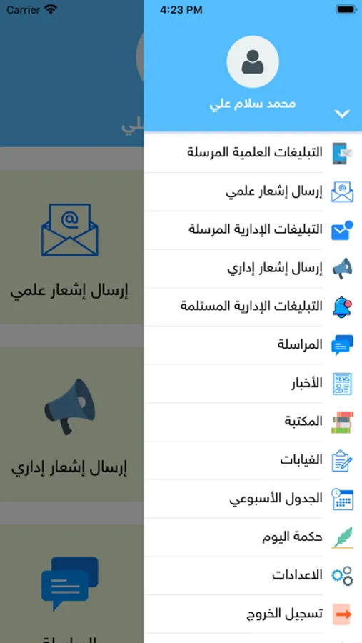 - يوفر التطبيق إمكانية إرسال تبليغات إدارية أو علمية من قبل الأستاذ مع إمكانية إرفاق صور مع التبليغ وظهور إشعار صوتي لحظة وصوله.
