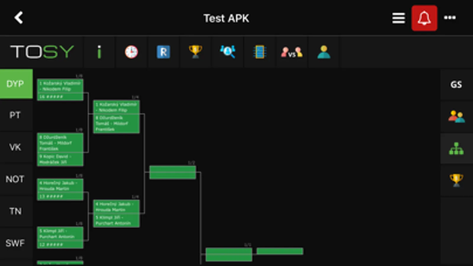 V aplikaci vidíš všechny nebo jen své zápasy daného turnaje ať už aktuálně probíhající, odehrané nebo ve frontě k odehrání. Můžeš zadávat výsledky, dostávat notifikace o vyhlášeném zápasu a mnoho dalších funkcí usnadňujících průběh turnaje