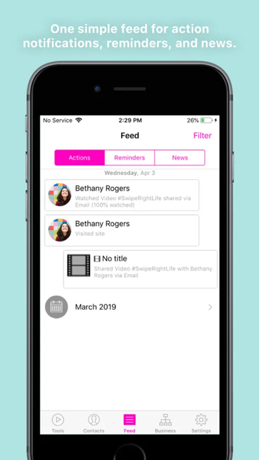 Tools: It has never been easier to share information about your products and opportunity via SMS text, email, or social media. Simply choose tools specifically designed to promote your business and share them with a contact. You'll receive a notification when contacts view a tool so you know exactly when to follow up! You can even add your own tools. Record or upload short videos to share with prospects. You can even add actions to your videos so prospects can interact directly in the video. These smarter interactive tools are called a Brightool and they provide more data for follow up with ActionAlert notifications in the Feed. No data connection? No problem! Simply download tools such as videos in the app beforehand for offline playback.
