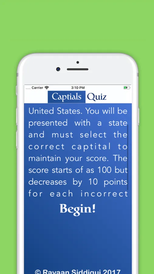 This app is a fun and challenging States and Capitals Quiz. It quizzes you on all 50 states and their capitals. Download the app and begin immediately, for free!