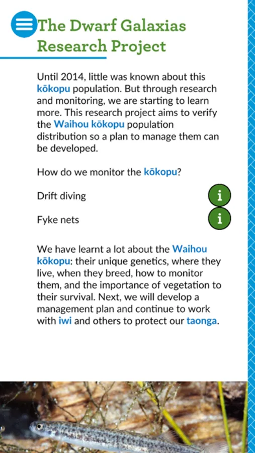 Kōkopu / dwarf galaxias are non-migratory galaxiids, similar to whitebait, however, they live their entire life in the awa where they hatched. Whitebait spend part of their life living at sea.