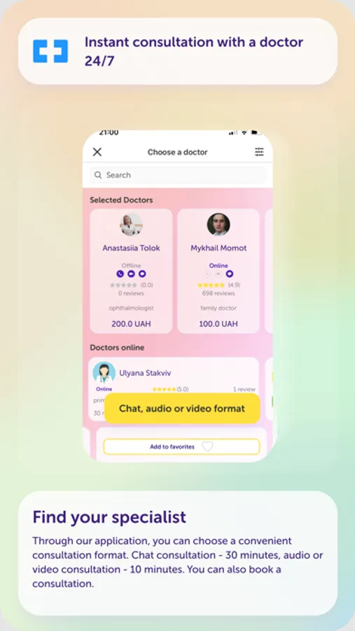 Doctor Online - Health Assistant is a mobile health monitoring service to consult with qualified doctors of any profile in online video, audio and chat 24/7. Family doctors, therapists, pediatricians, urologists, cardiologists, dermatologists, endocrinologists, gynecologists and neuropathologists are ready to help you in the Doctor Online App.