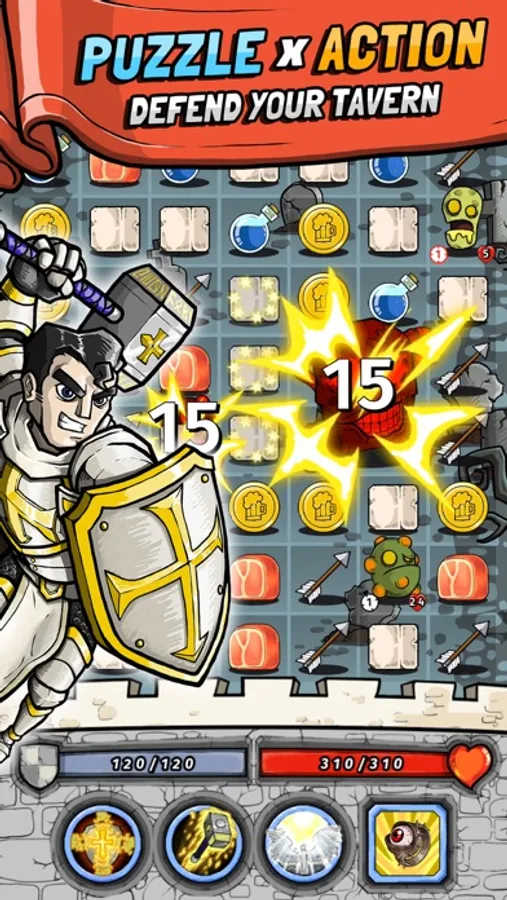 It's not another Puzzle RPG clone! In this game, plenty of monsters advance THROUGH tiles on the board to attack the tavern. You can slash them by simply tile-matching at the high pace of an action game.