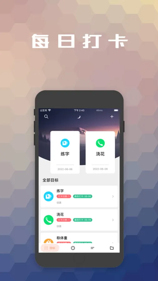 1、目标打卡:可设置提醒频率,提醒你待办事项,可以记录打卡的记录,记录打卡心得,分析打卡的频率,时间轴查看打卡记录。帮助你养成一个良好的习惯