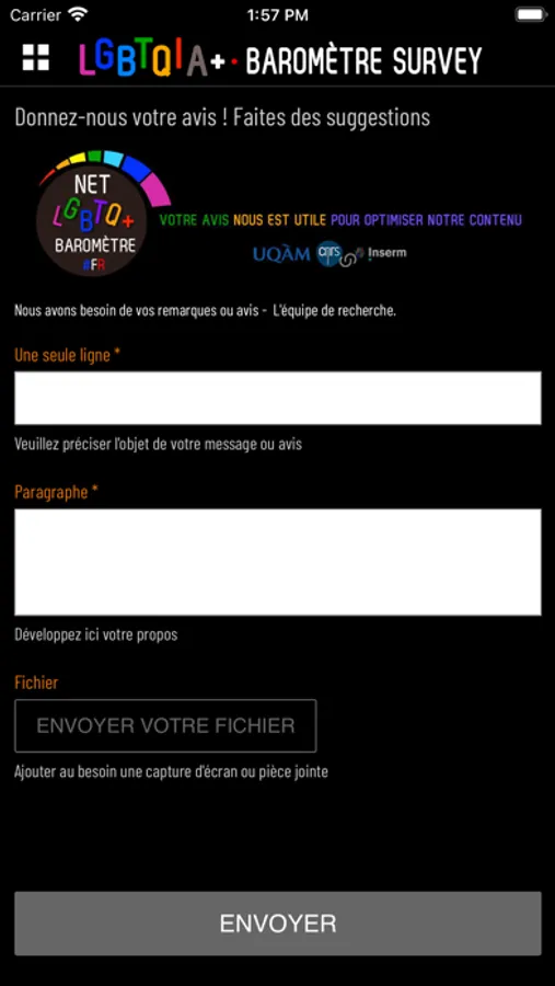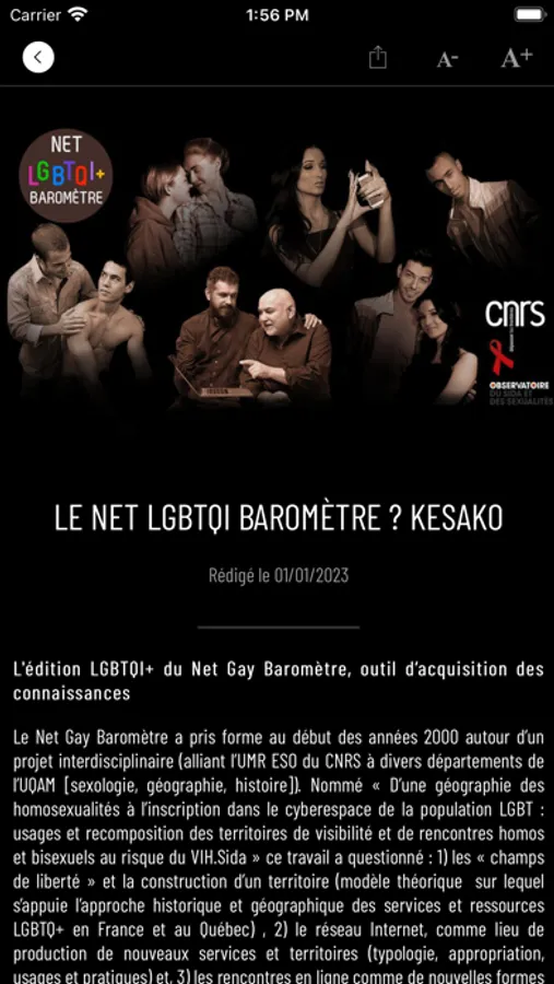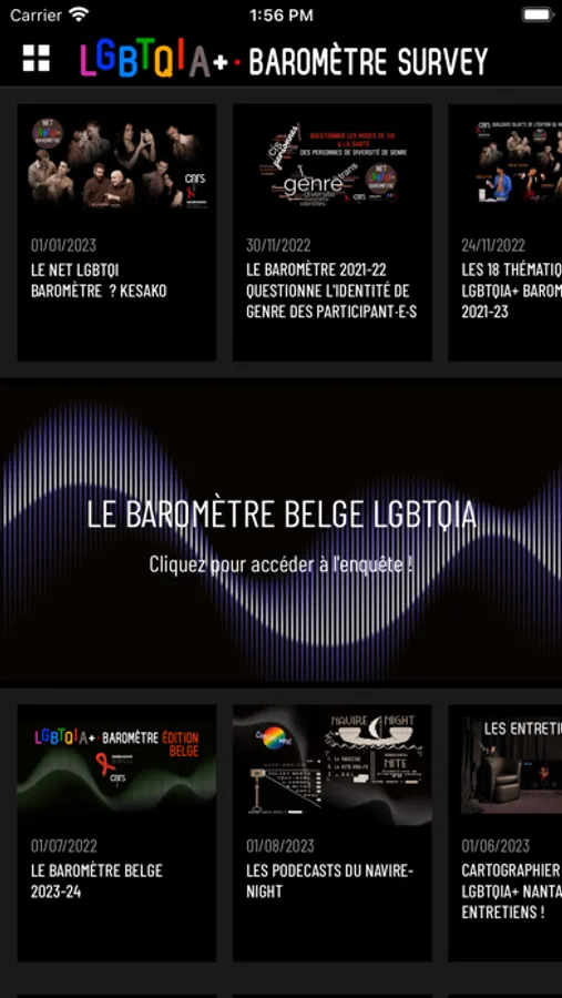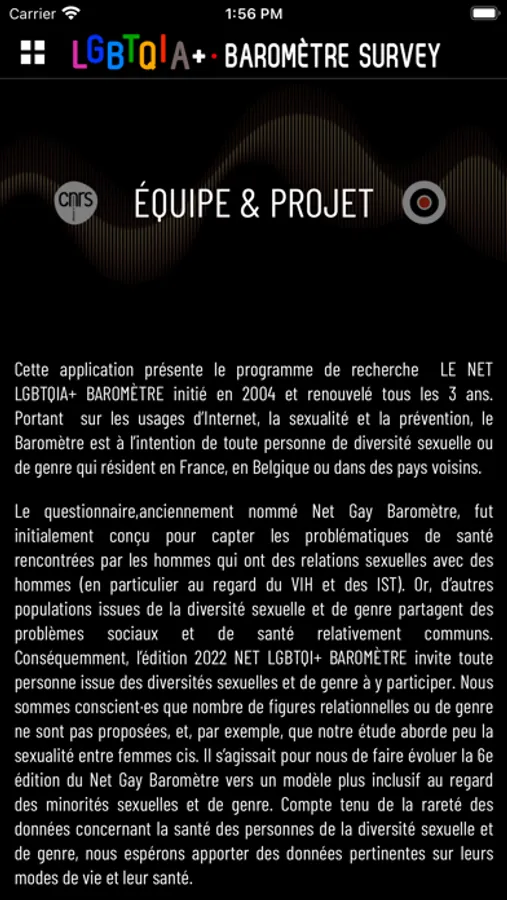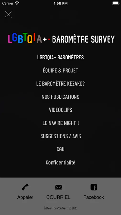 Les données produites par cette étude permettent de transférer des connaissances vers les communautés LGBTQIA+, l'application étant un des éléments de ce processus. Sous la responsabilité éditoriale de l'association Com on west (RNA W442002563, Nantes, France) finançant le Baromètre et sa promotion, nous vous présentons les principaux résultats issus de ses éditions les plus récentes organisés par thématiques : santé sexuelle, identité de genre, etc. Quelques clips vidéos vous sont proposés pour vous remercier de votre attention et illustrer certains sujets. Nous avons aussi implémenté d'anciennes émissions que notre association avait réalisées au milieu des années 80 sur Fréquence Gaie (Radio FG) : Le NAVIRE-NIGHT aux thématiques toujours d'actualité.