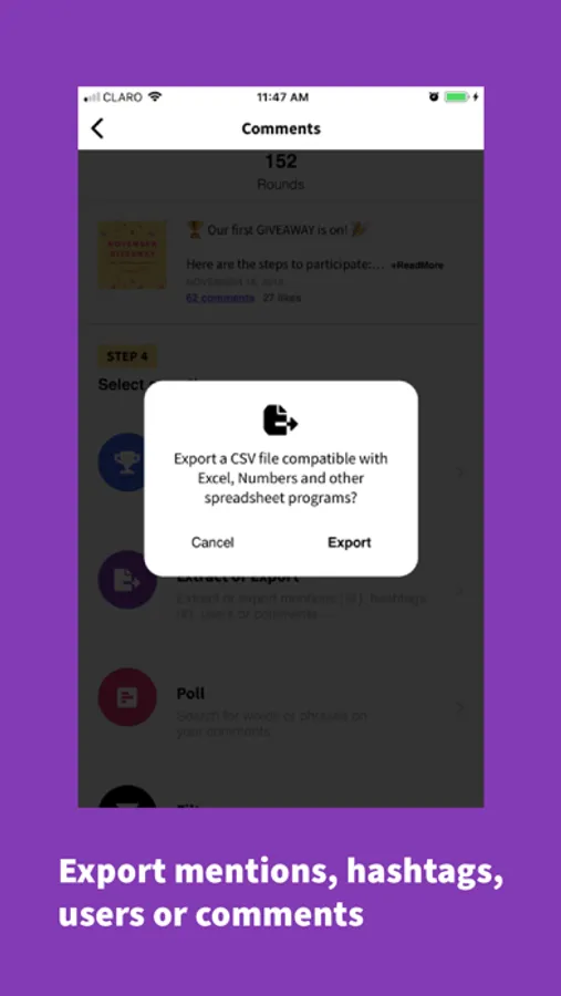 We help Instagram Businesses & Creators extract useful content from their comments, like mentions, tags, users, emojis, words or phrases. Then, choose a winner with our RandomPicker or export the comments or specific content as a CSV file compatible with Excel, Pages and other spreadsheet programs.