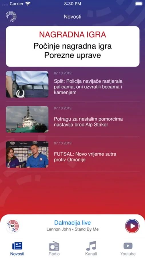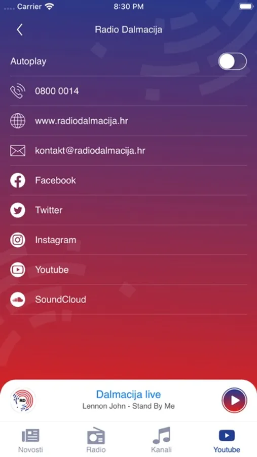 Slušajte Radio Dalmacija gdje god se nalazili. Pročitajte najnovije vijesti iz Hrvatske i ostatka svijeta izravno iz aplikacije. Pregledajte naše profile na društvenim mrežama poput Facebooka, Twittera i Instagrama ili slušajte glazbu na našem SoundCloud i YouTube kanalu.