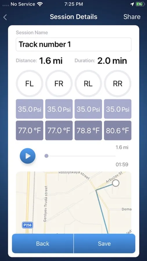 - Advanced Mode: Get the most out of your tires on the road or track! Advanced Mode records and reports advanced 'Session' analytics including a GPS map-view, minimum and maximum tire conditions, session playback and even recommends pressure adjustments to improve tire performance. This information is also exportable for further analysis by enthusiasts and shareable with friends through your social media.