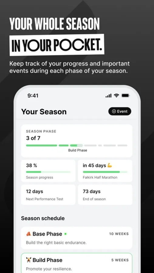 - You'll receive an overview of your whole season showing your goal, when you will achieve it, and what your training will focus on during each phase.