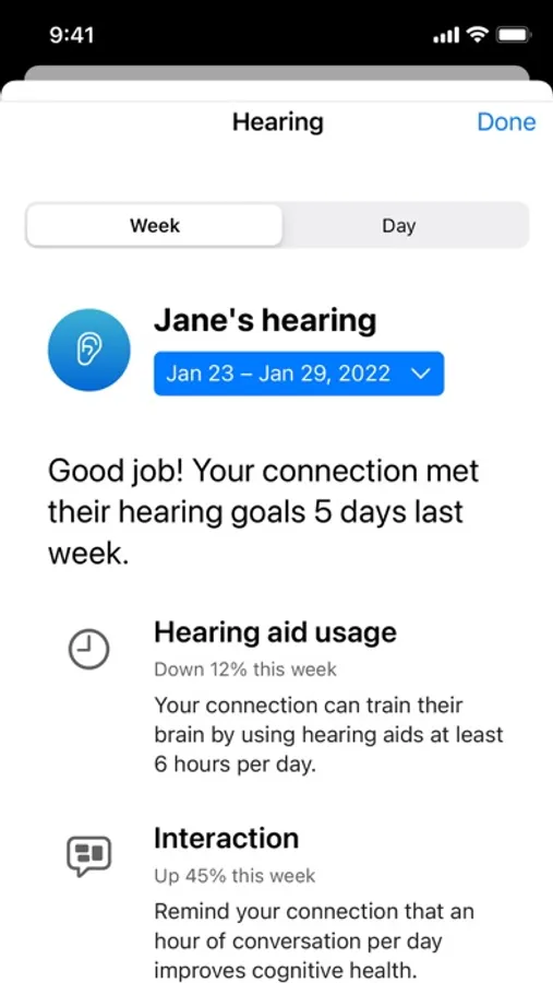 Hear Share allows your hearing aid wearer to share progress of their hearing aid use, physical activities, and overall wellness with you – from their hearing aid app. The information they share is their choice.
