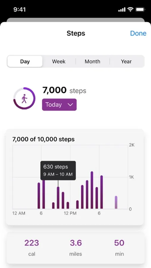 • Graphical look at progress, plus insights and general activity information – all viewable by day, week, month, or year