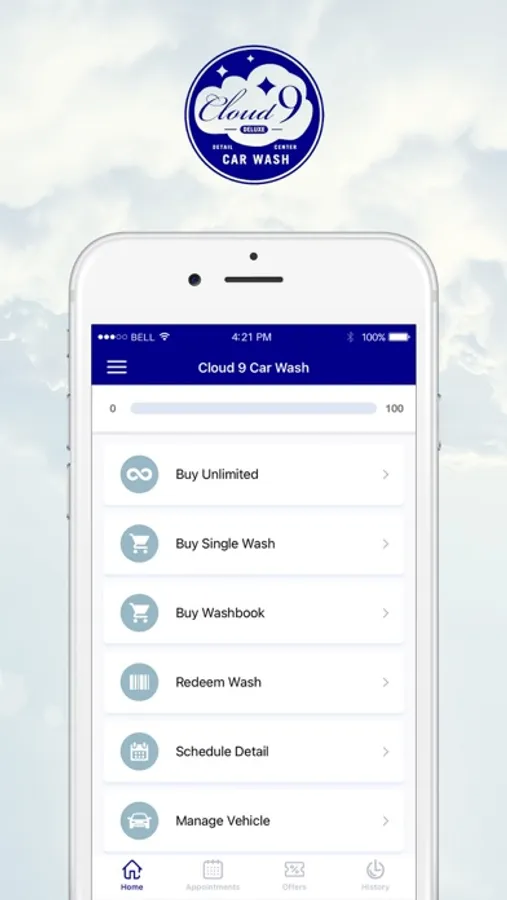 The Cloud 9 Car Wash App can be used to manage unlimited wash plans, wash books, redeem washes,