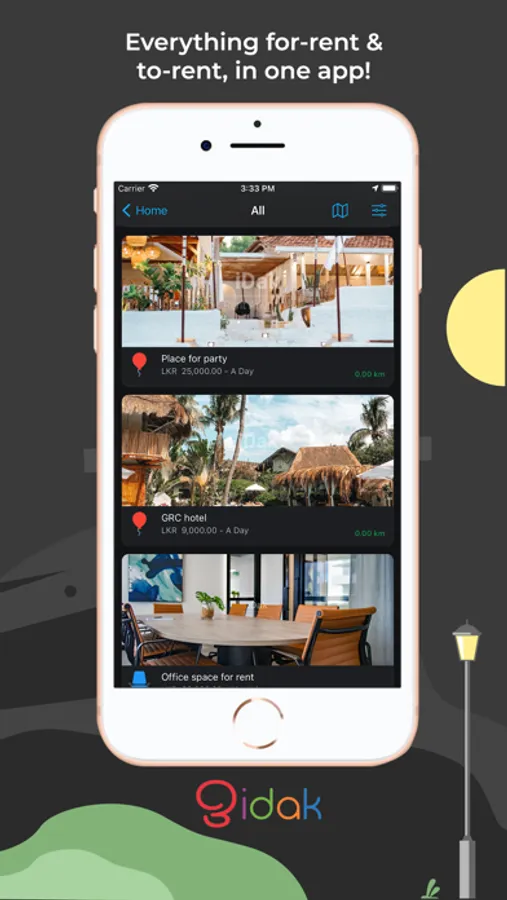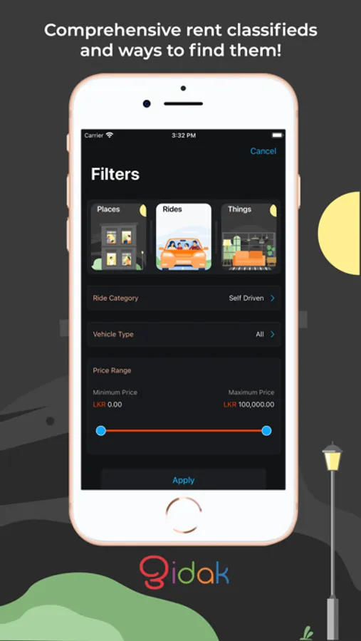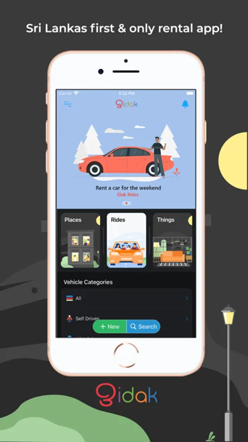 idak is Sri Lanka’s first & only app designed to create an online marketplace exclusively for rent purposes which contains limitless listings under Places, Rides & Things.