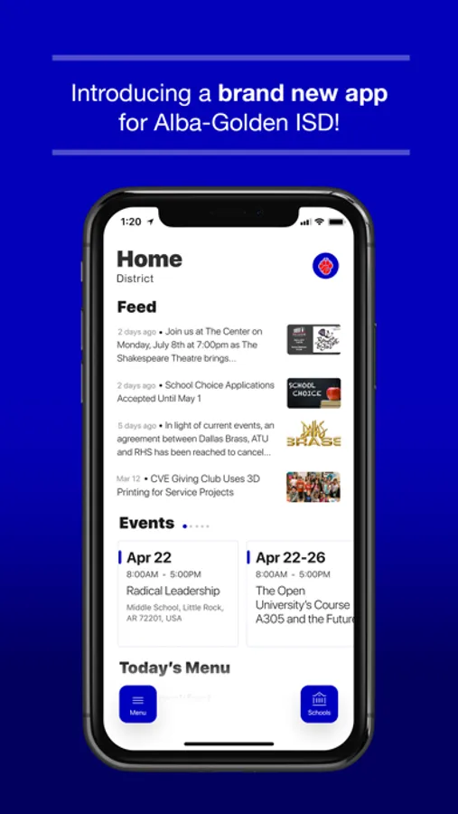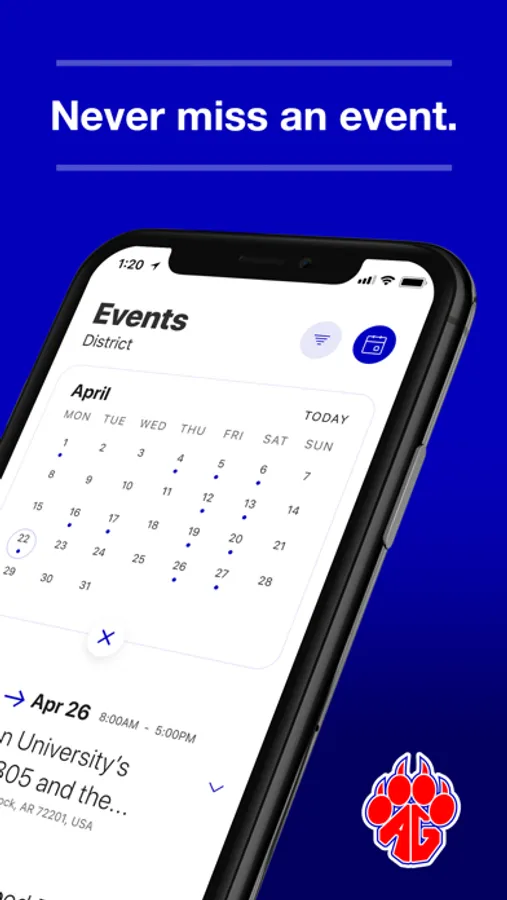 The event section shows a list of events throughout the district. Users can add an event to your calendar to share the event with friends and family with one tap.