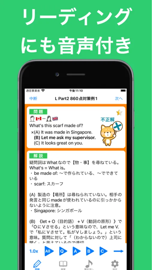 リーディングセクションPart5対策の全ての問題の解答画面でナレーターによる正解英文の読み上げ音声を聞くことができます。