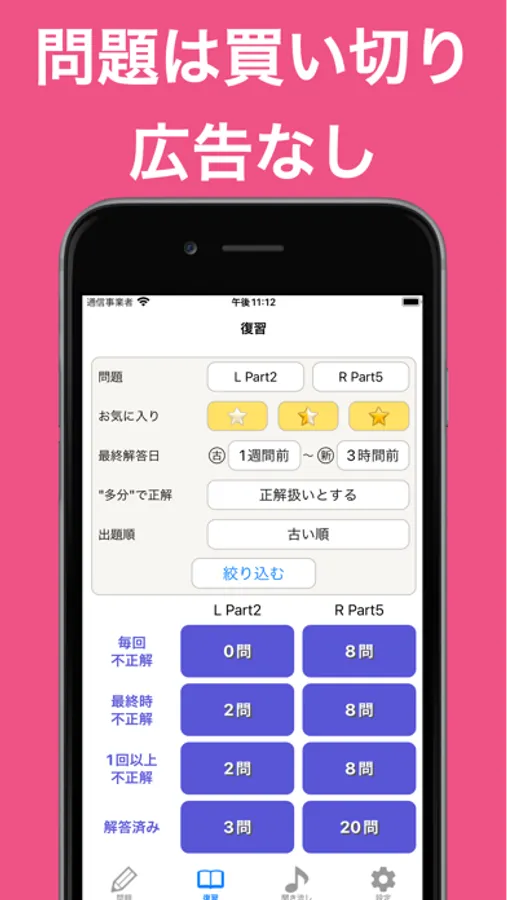 本アプリでは、「毎回不正解」「最終時不正解」「1回以上不正解」「解答済み」それぞれの問題を1クリックで簡単に復習できます。