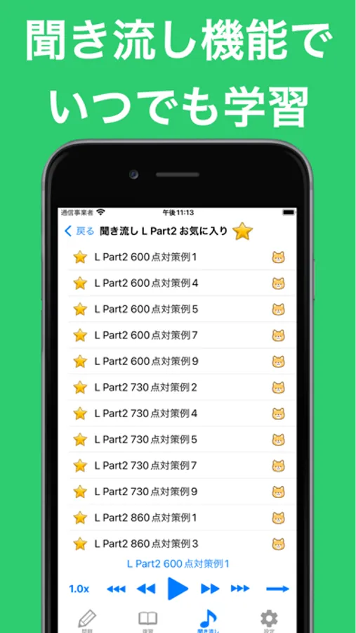 また、お気に入りに登録した問題だけを連続再生して聞き流しすることができる便利な機能もついています。