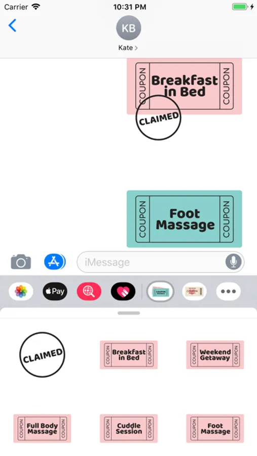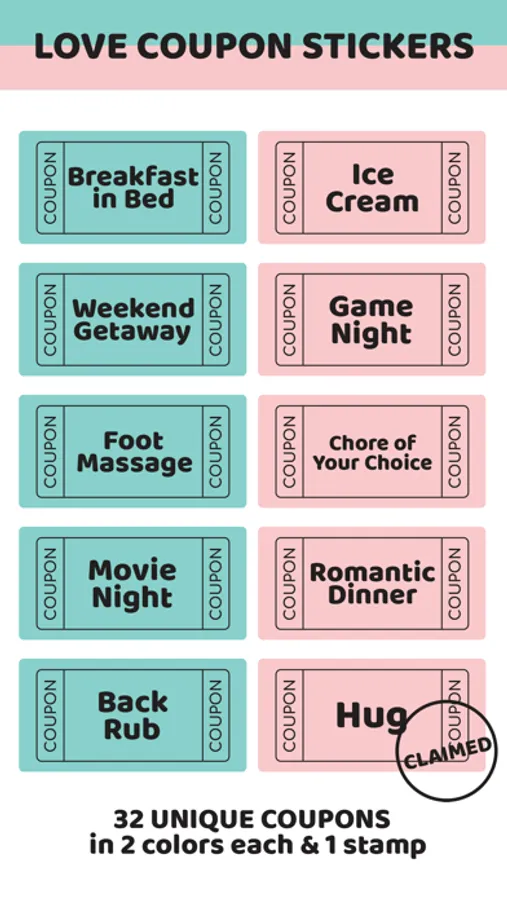 32 unique love coupons in 2 colors each & 1 CLAIMED stamp included.(Total 65 stickers)
