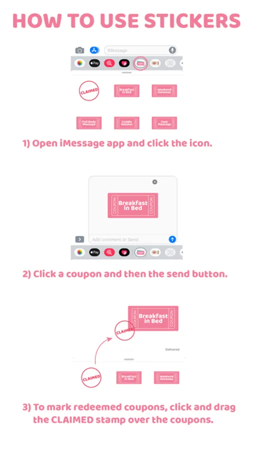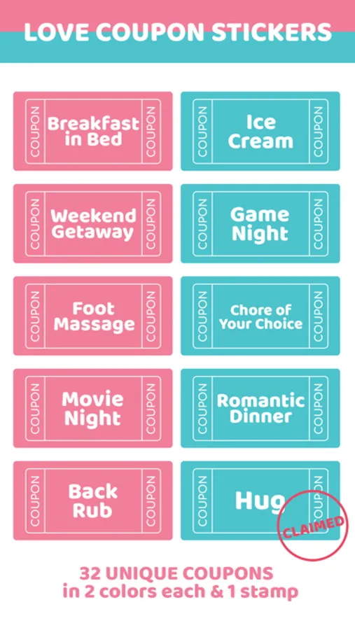 32 unique love coupons in 2 colors each & 1 CLAIMED stamp included.(Total 65 stickers)