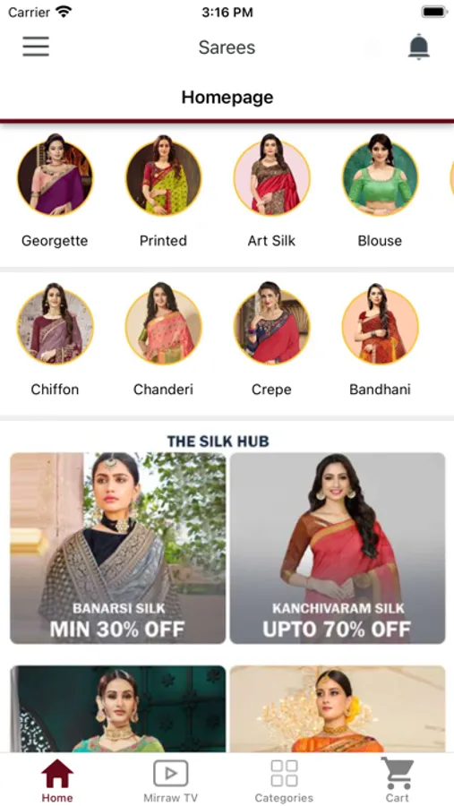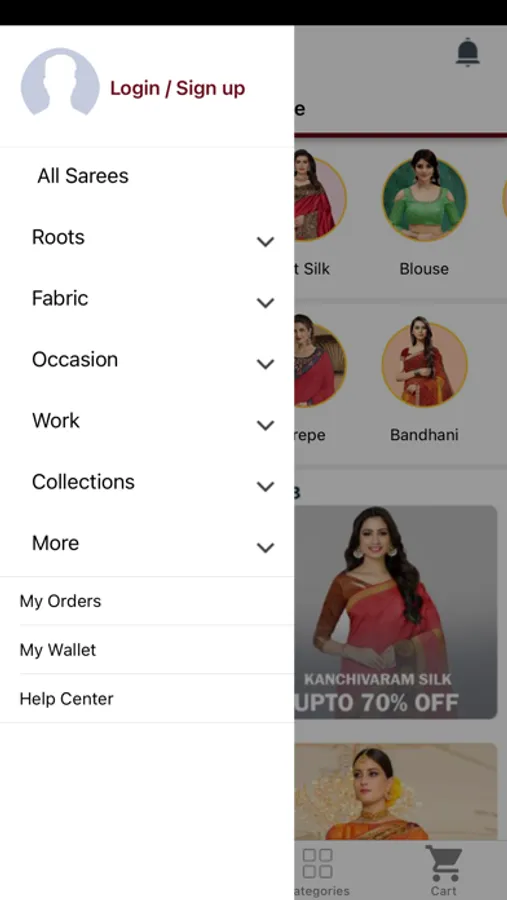 App includes all saree types including fabric material, embroidery work, party wear, casual and many more